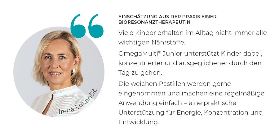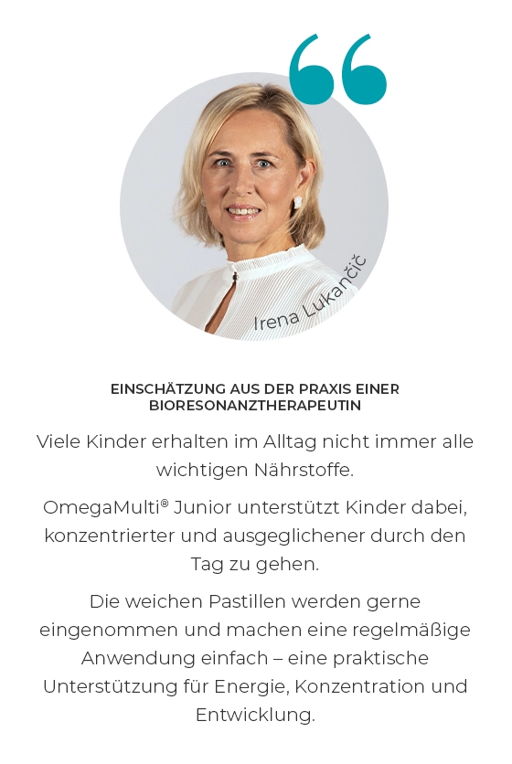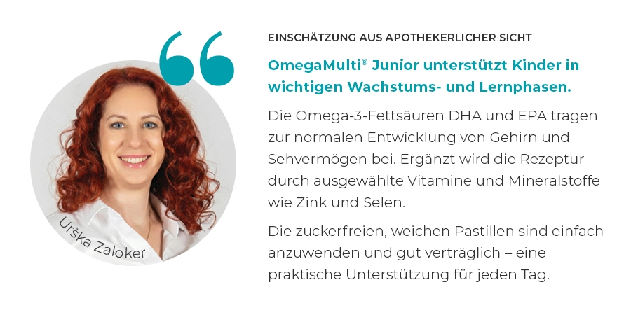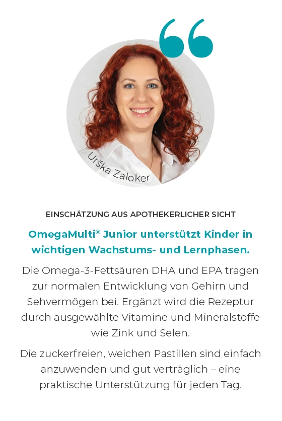 OmegaMulti® Junior sind leckere Weichpastillen mit ausgewählten Vitaminen, Mineralstoffen und Omega-3-Fettsäuren. Sie versorgen Ihr Kind täglich mit allem, was es für gesundes Wachstum, Konzentration und eine optimale Entwicklung braucht. Eine kleine, fruchtige Multivitaminbombe – entwickelt, damit Kinder stark, fokussiert und voller Energie bleiben.